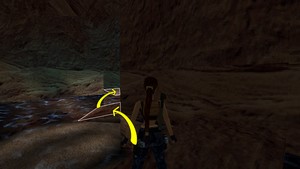 Après avoir chuté à travers le cabanon, tomber dans l'eau et sortir de l'autre côté dans un canyon. Aller à droite et suivre le chemin (IMAGE 1), tuer un vautour puis continuer jusqu’à arriver face à une paroi escaladable (IMAGE 2). Sauter pour s’y accrocher, descendre, lâcher pour se raccrocher à la faille en-dessous et entrer dans le trou à droite.