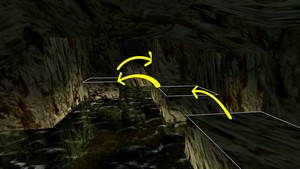 Au début du niveau, prendre le quad, mais s'arrêter avant de sauter par-dessus la rivière. Descendre et se suspendre sur la rive à droite (IMAGE 1). Suivre l'échelle par la gauche puis lâcher prise. Se retourner et sauter avec élan vers le rebord dans la grotte. Sauter de rebord en rebord (IMAGE 2) en suivant le cours du fleuve (sauts avec élan en s’accrochant pour les plus longs) et ne surtout pas tomber à l’eau ! Enfin, faire le grand saut vers la zone secrète. Rebondir sur les pentes sans tomber dans les pièges pour grimper en haut.