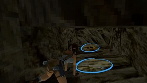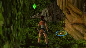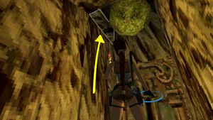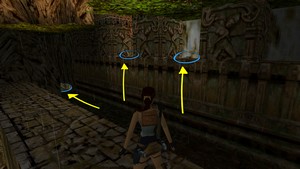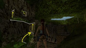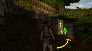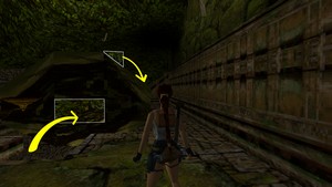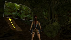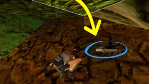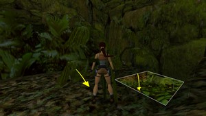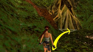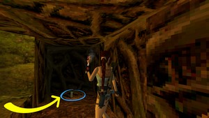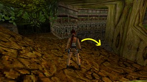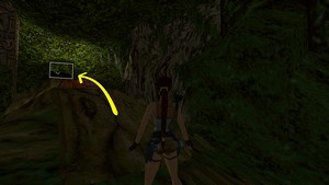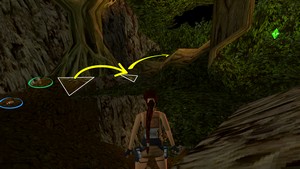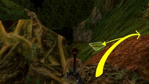 Dès le début du niveau, sans même avoir déjà bougé, sauter à droite (IMAGE 1) et se laisser glisser jusqu'à la petite zone plate. Sauter alors à gauche (IMAGE 2) en maintenant la touche Action : Lara va glisser contre les racines et tomber sur la zone secrète (IMAGE 3).
