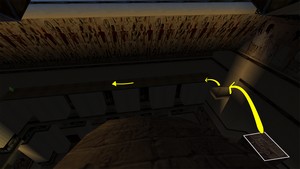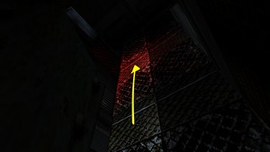 Après avoir pris le secret 1, sauter pour s’accrocher dans le passage au-dessus. Se tourner à droite et se hisser, puis se retourner et sauter vers l’ouverture sur la gauche pour revenir sur le rebord surplombant la grande salle. Revenir à droite dans le réduit et appuyer sur l’interrupteur. Se retourner et se hisser sur le bloc puis grimper sur le grillage (IMAGE 1). Se placer à gauche au-dessus des barbelés puis monter de quelques mètres. Faire un saut arrière retourné et s'agripper derrière (IMAGE 2). Grimper jusqu'à la roquette. Lâcher prise et se rattraper aussitôt puis entrer dans le petit tunnel.