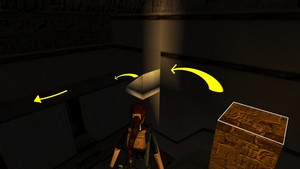 Après avoir récupéré le cristal à l'aide de l'échelle horizontale au sommet de la salle égyptienne, se laisser tomber sur la tête du Sphinx (IMAGE 1). Se placer face à la colonne isolée en bas à gauche : faire un saut en avant en maintenant la touche Action pour tomber sur une petite trousse. Sauter ensuite sur la colonne isolée, puis sur la plate-forme contre le mur blanc (IMAGE 2). Glisser ensuite, puis sauter en face. Longer à gauche.