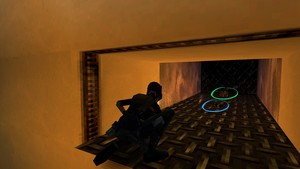 Après avoir ramassé le secret 3, descendre en bas de la salle (en glissant contre le Sphinx) et contourner la statue géante. De l'autre côté, tuer un garde et monter les marches (IMAGE 1). Au fond du couloir et grimper d'un niveau. Se retourner et sauter vers le tunnel à droite (IMAGE 2).