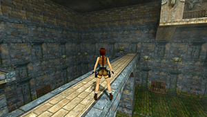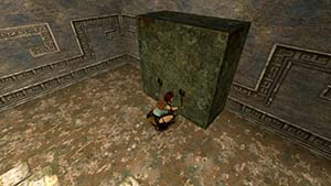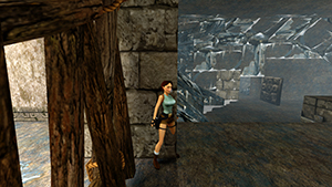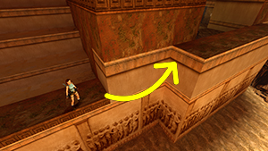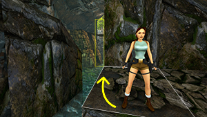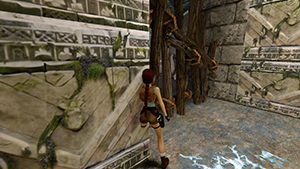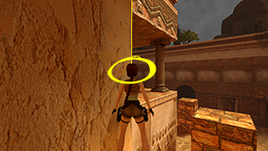 Tout comme le corner bug et le saut entre deux textures, l'impact de Lara entre une pente et un mur lui permet de se téléporter tout en haut de ce dernier.