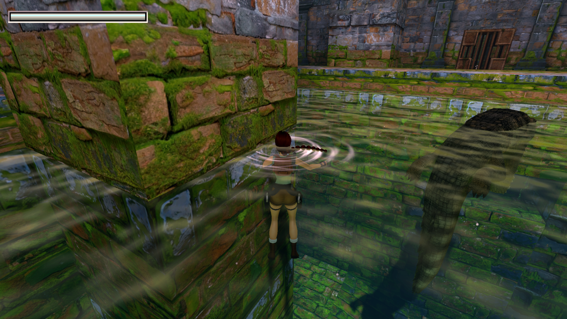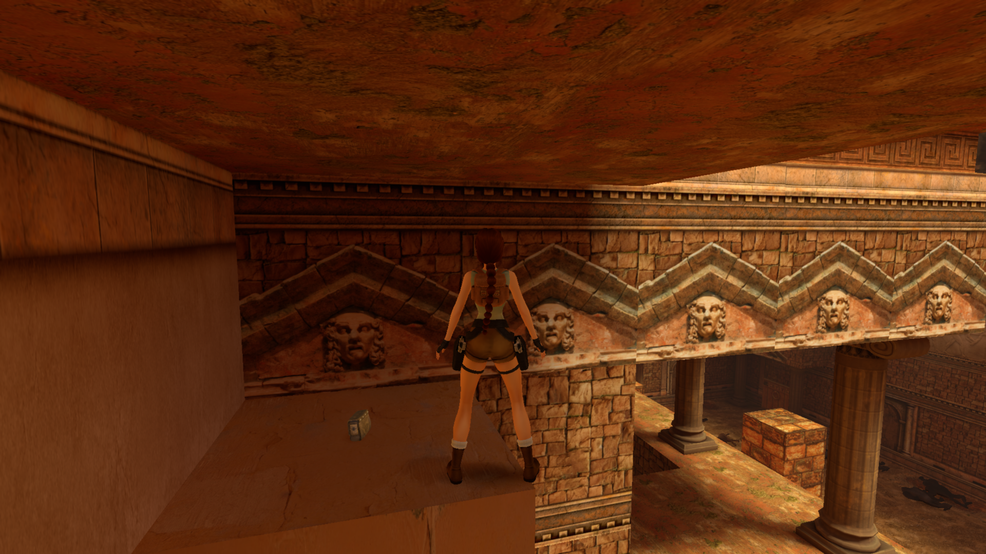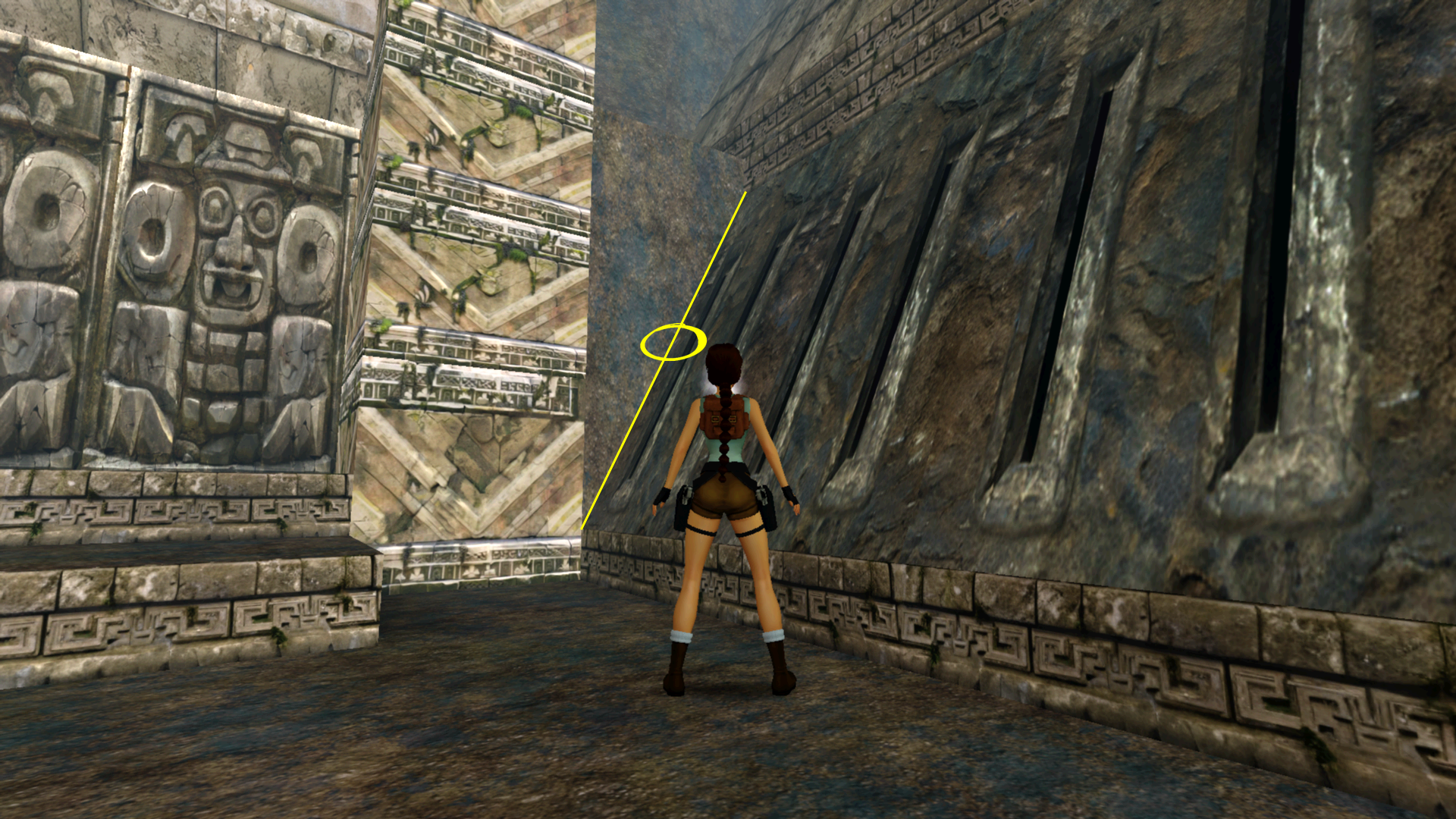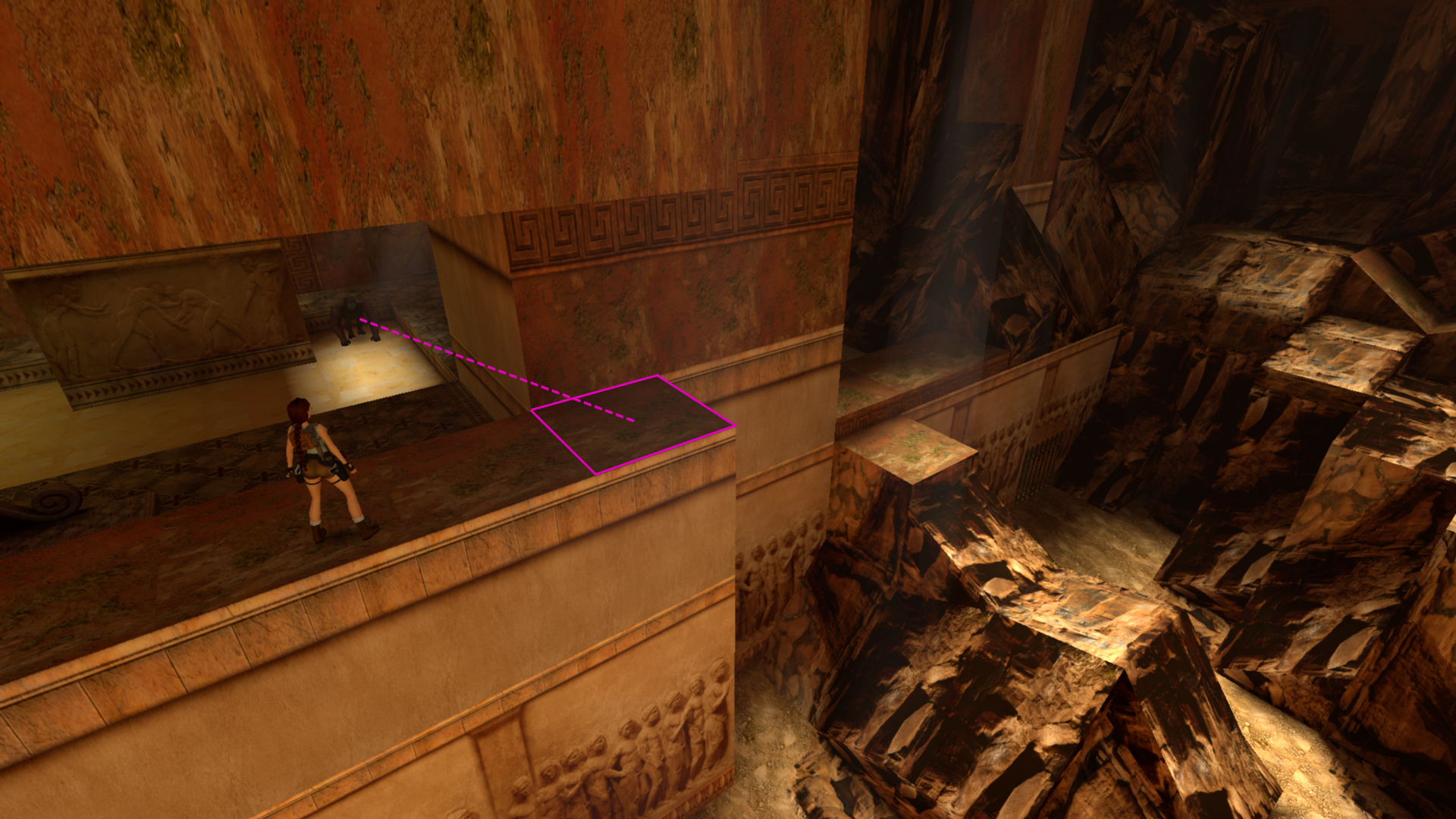 Tout comme le corner bug et le saut entre deux textures, l'impact de Lara entre une pente et un mur lui permet de se téléporter tout en haut de ce dernier.