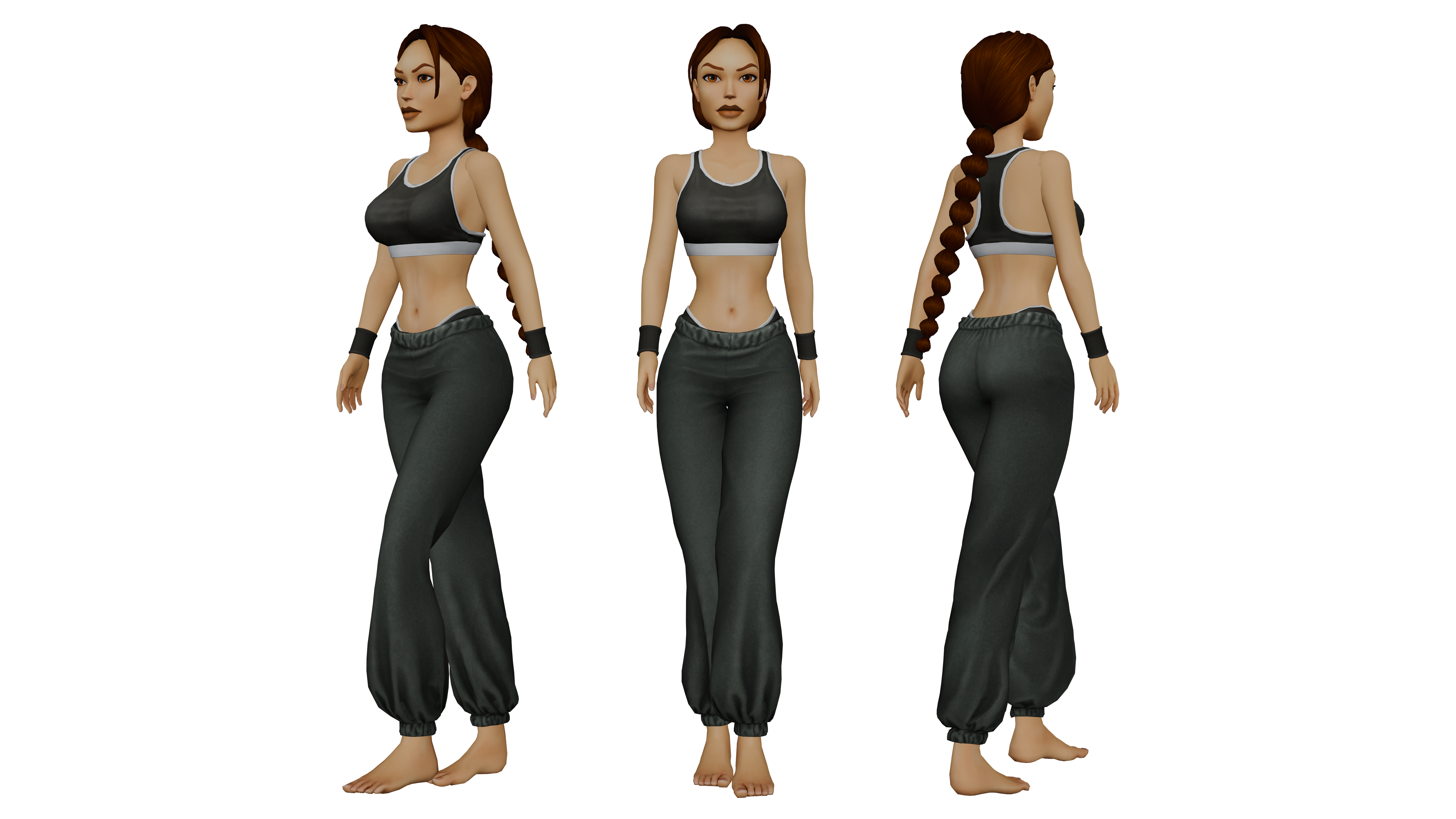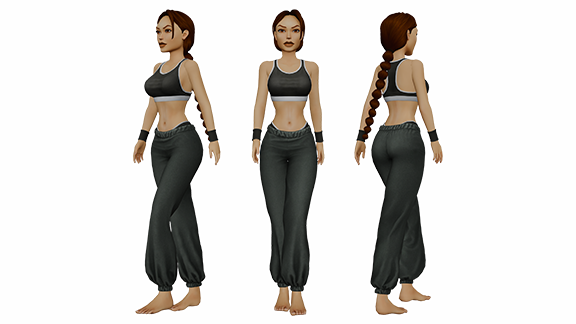 Dans les premiers croquis du personnage, lorsqu'elle était encore appelée Laura Cruz, Lara portait un pantalon beaucoup plus ample. Mais lors de la modélisation du modèle 3D, les développeurs ont dû remplacer le pantalon par un mini-short en raison de contraintes techniques. Dans son livre "L'histoire de Tomb Raider", Alexandre Serel explique que le modèle de Lara possède des jointures trop visibles au niveau des genoux et des épaules, aussi le rendu d'un t-shirt à manche longue et d'un pantalon ne rendait pas bien. Les jointures couleur chair passe mieux à l'écran. Paul Douglas nous apprend sur Twitter que la tenue de sport a été conçue à la fin du développement du jeu, à ce stade, le moteur graphique était bien mieux optimisé et permettait d'utiliser d'avantage de polygones sur le modèles de Lara, améliorant ainsi l'apparence du pantalon. Il était cependant trop tard pour revenir sur la tenue classique.