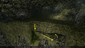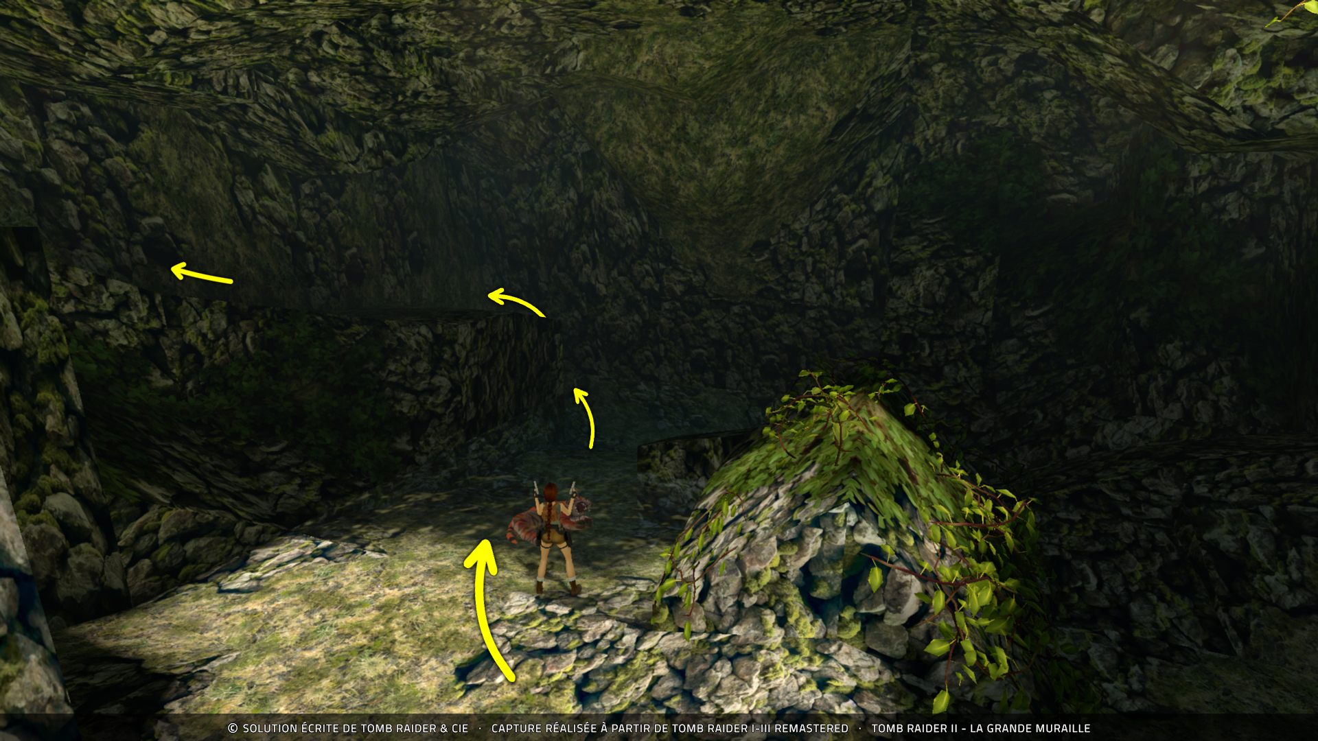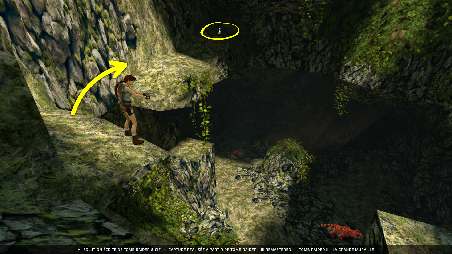 Se laisser glisser et se diriger vers le fond de la grotte. Entrer dans l'eau et aller au fond à gauche du bassin, derrière le bloc (IMAGE 1). Le rugissement d’un tigre se fait entendre. Grimper sur la corniche puis tirer sur le tigre en contrebas. Continuer sur la corniche en sautant de bloc en bloc puis, tout au bout, grimper d’un niveau. Se retourner puis sauter avec élan sur la corniche suivante en face. Avancer un peu et tuer un autre tigre en contrebas. Regarder ensuite sur la droite (IMAGE 2) : il y a une autre corniche avec un item brillant. ✨
