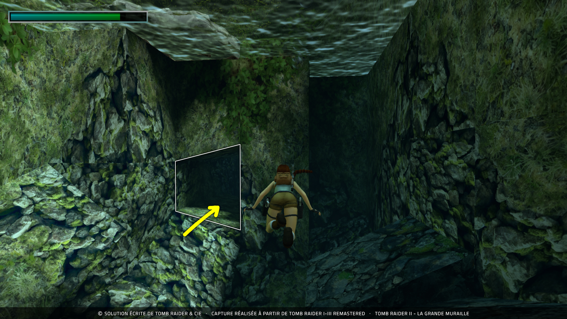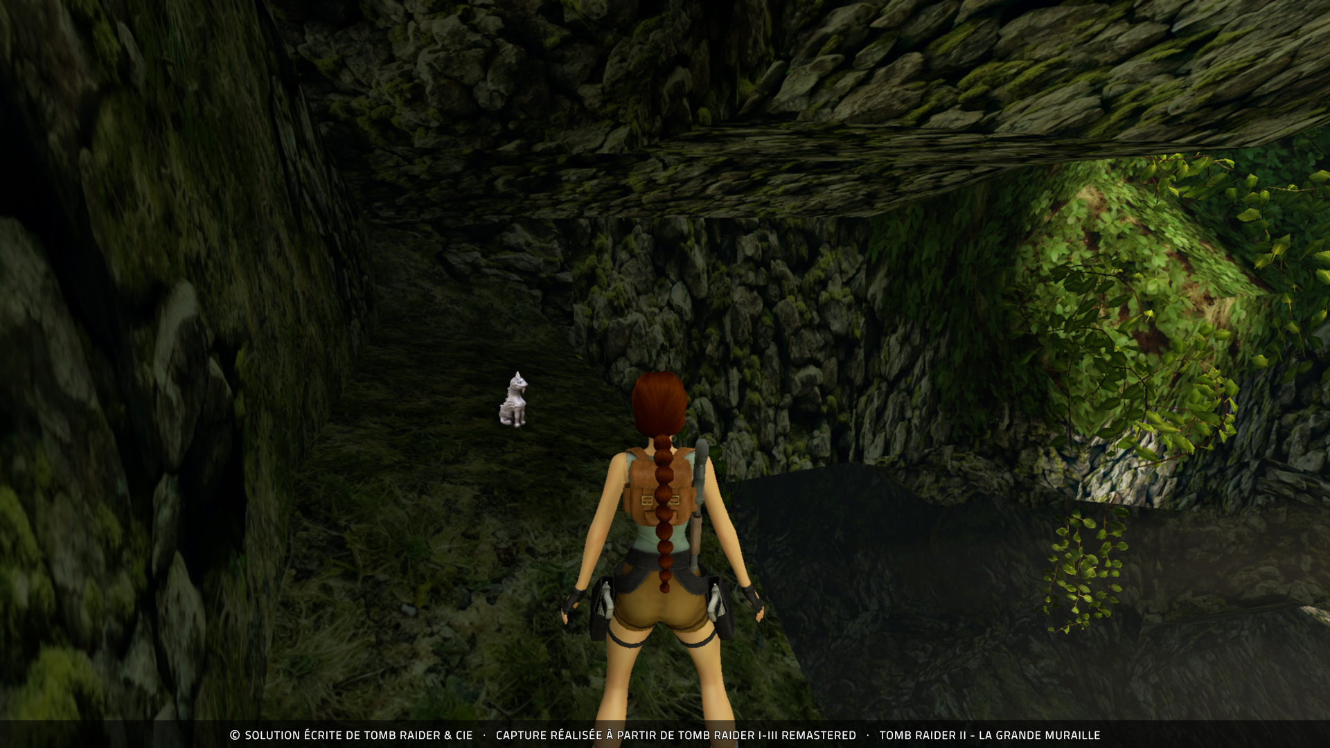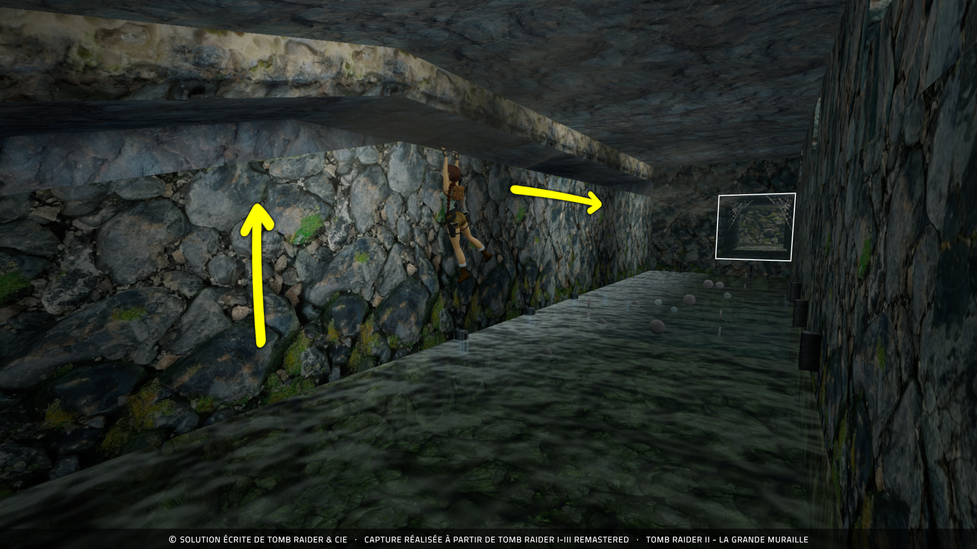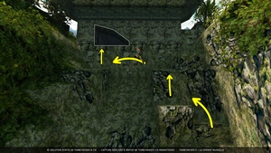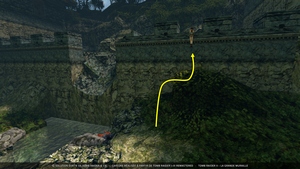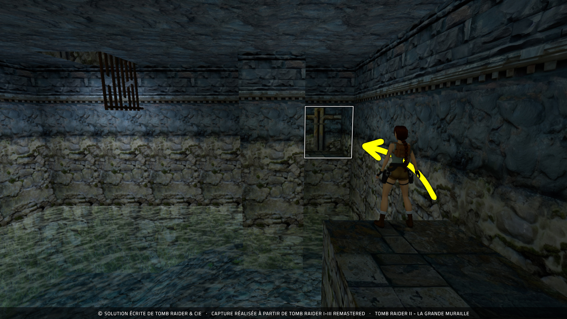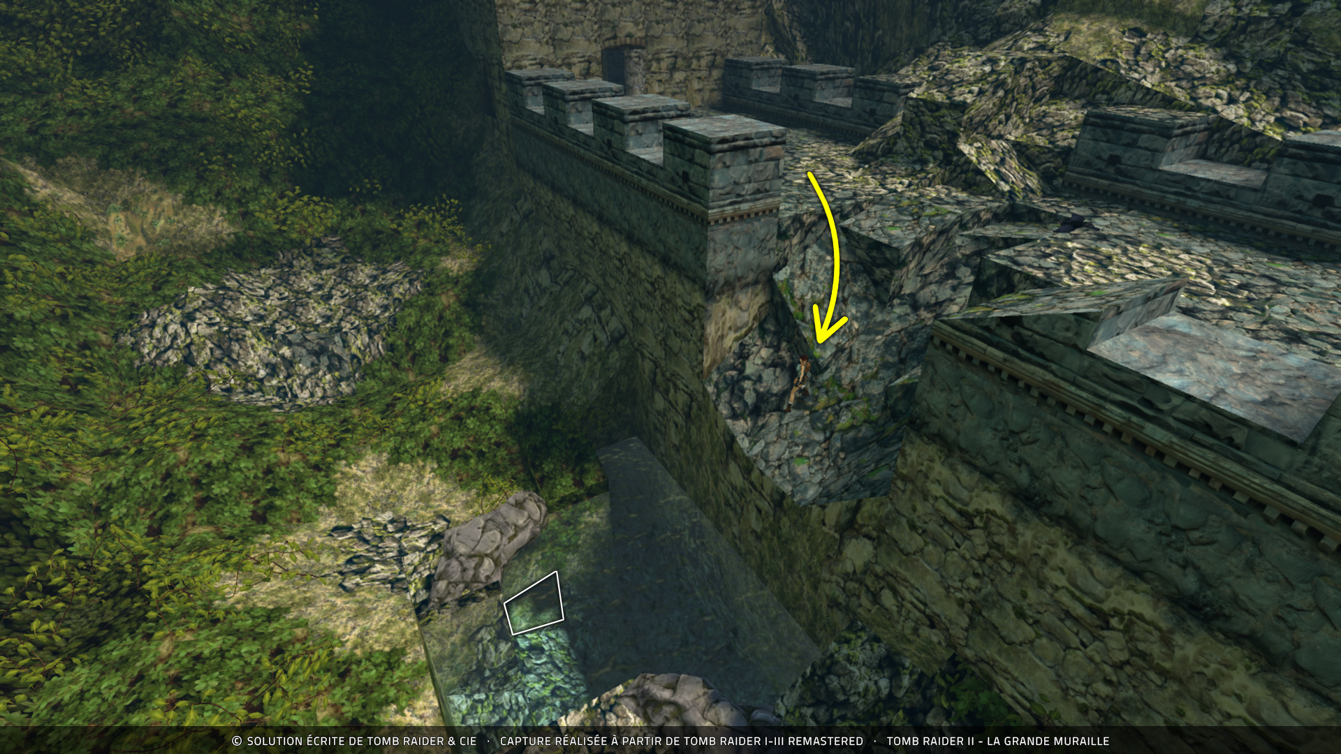 Une fois dehors, sortir les pistolets et tuer 3 corbeaux. Descendre au niveau de la faille (IMAGE 7) et plonger dans le lac. Nager vers la droite dans un tunnel (IMAGE 8) et récupérer au fond une clé des gardes. Sortir de l’eau et tuer un tigre. Remonter sur la muraille à l’aide des rochers verts (IMAGE 9) et se hisser entre les 2 créneaux. Utiliser la clé des gardes sur la serrure à côté de la porte pour l’ouvrir.