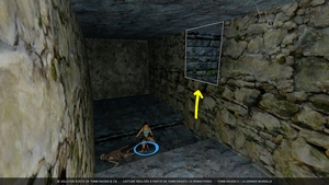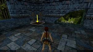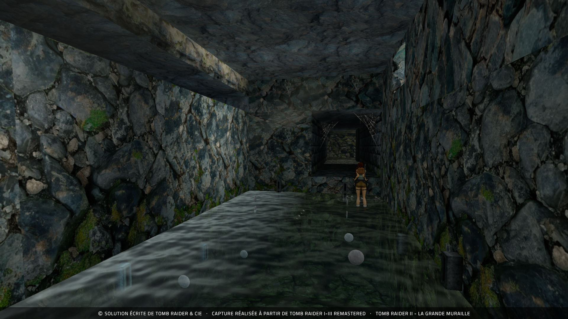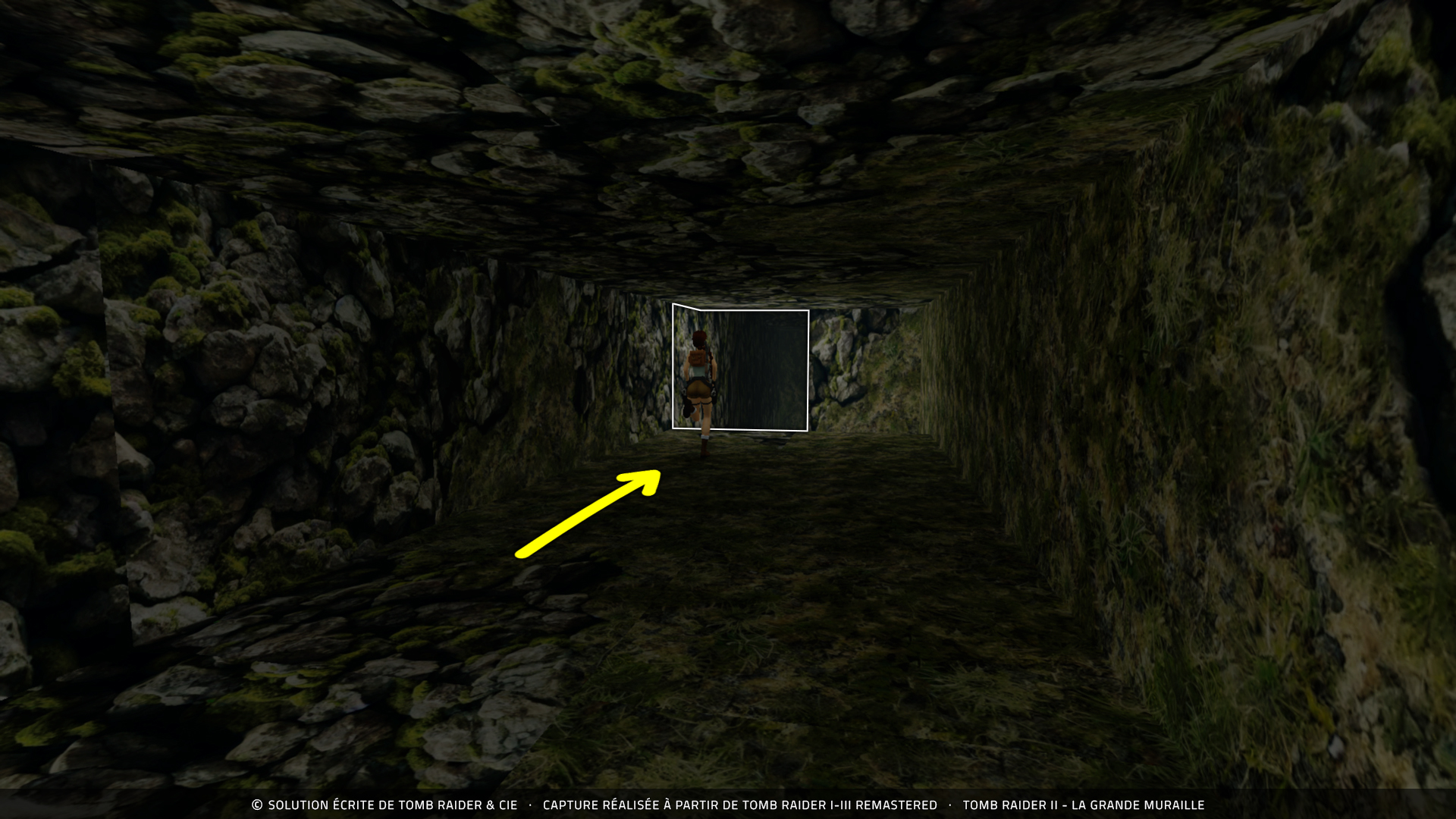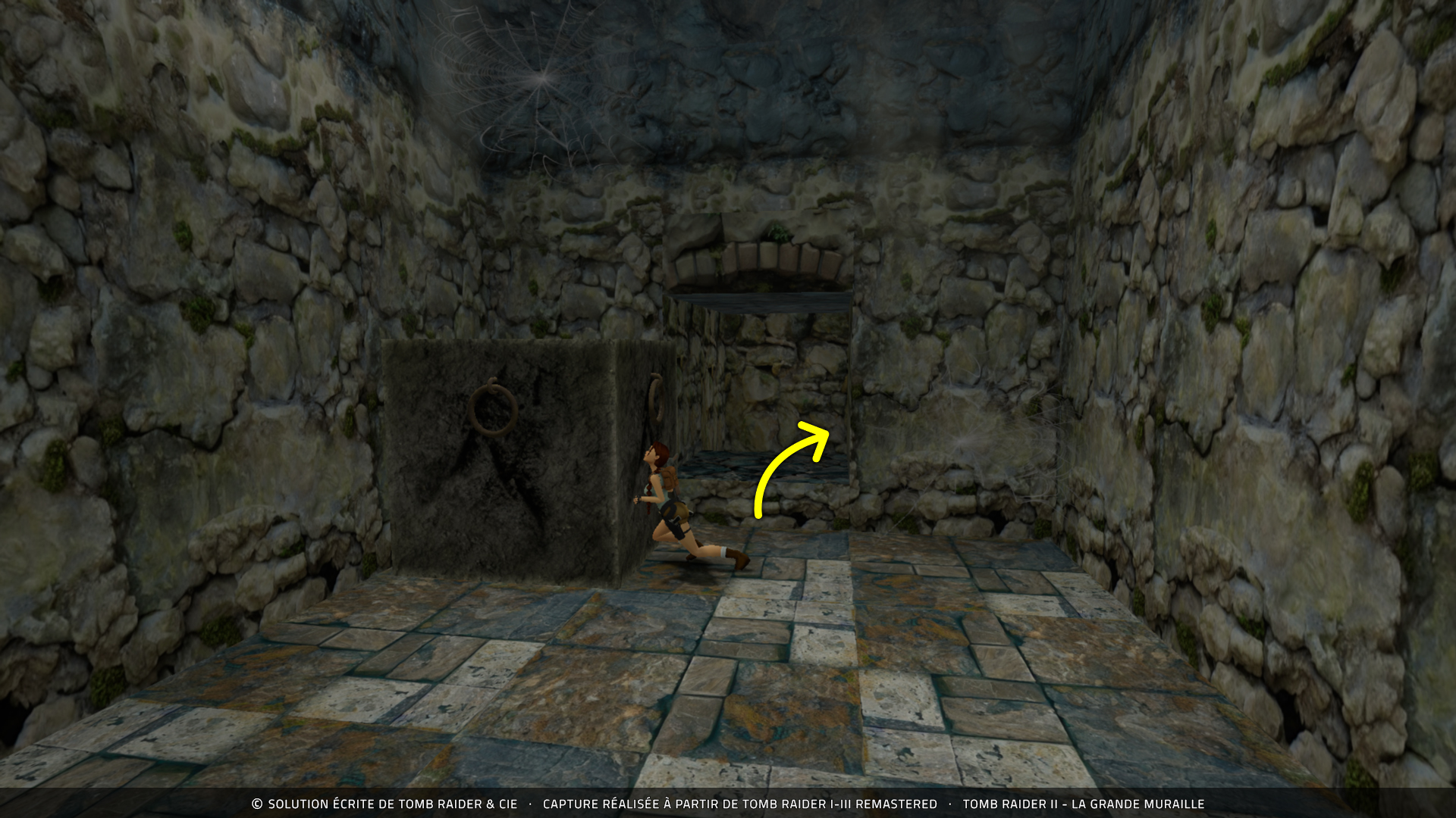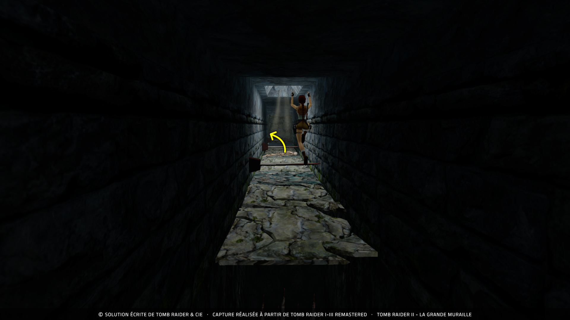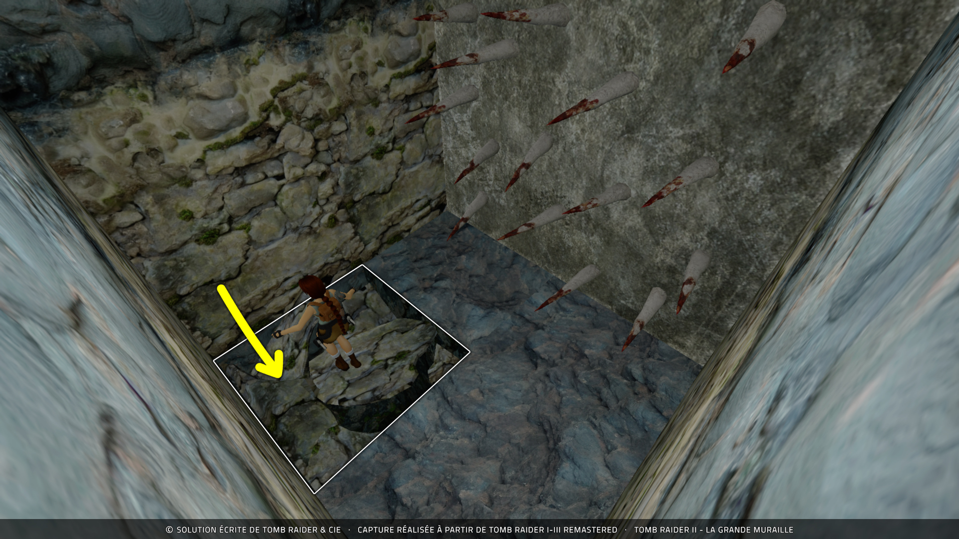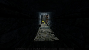 Dans le couloir après le bassin, courir sur les dalles piégées. Au bout, tourner à droite et se placer tout de suite vers la gauche contre le mur (IMAGE 15) (la caméra va s’inverser et il sera plus difficile de le faire après). Continuer de courir dans le passage, sauter par-dessus les pieux en effectuant un saut retourné (touche Roulande pendant le saut). Lara se retrouve à glisser en arrière, ce qui la positionnera prête à repartir.