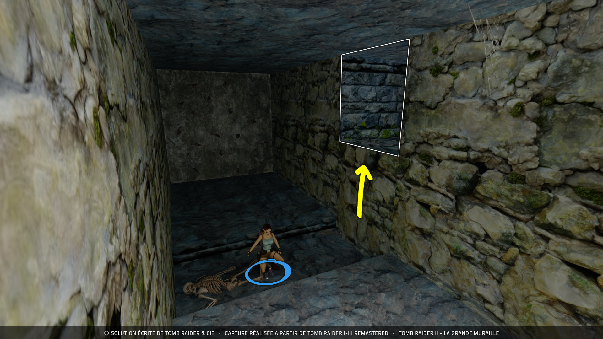 Une fois arrivé en bas, rouler rapidement pour ne pas perdre de temps (l'animation de la roulade est plus rapide que celle où Lara se relève) et ramasser en vitesse des munitions pour pistolets automatiques près du squelette (IMAGE 16) puis grimper dans l’ouverture avant que les murs garnis de piques ne se rejoignent au milieu. Continuer de courir sans s’arrêter sur les dalles et par-dessus les lames (IMAGE 17).