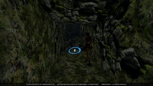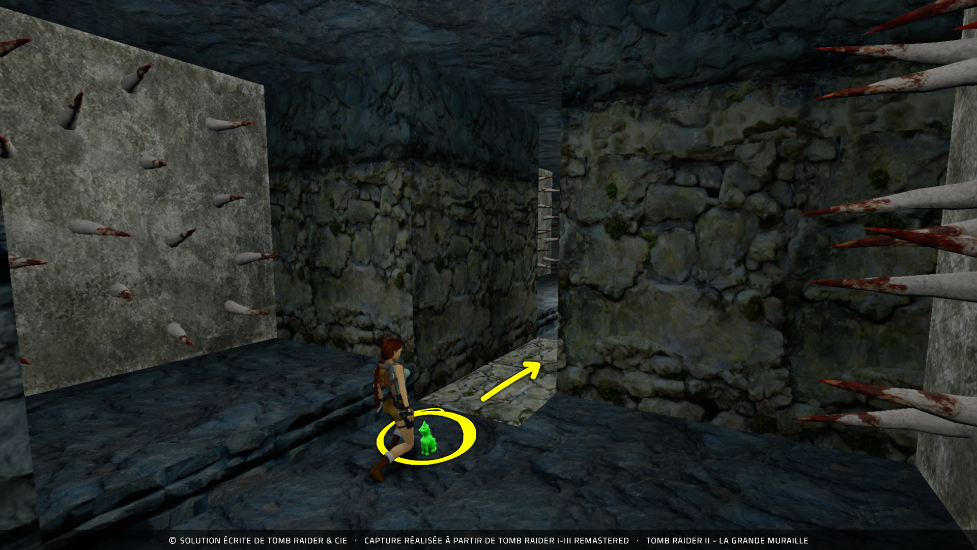 Continuer en courant sur les dalles, puis toujours tout droit pour éviter les murs garnis de pieux qui arrivent par la gauche. Au bout, se laisser glisser puis aller sans perdre une seconde sur la dalle friable dans le renfoncement à gauche (IMAGE 19) car un nouveau mur de piques avance vers Lara. Elle s’effondrera juste à temps. Avancer et ramasser une petite trousse de soin en faisant attention aux 2 disques qui roulent en travers de la grotte (IMAGE 20).