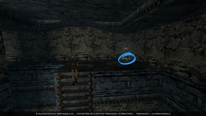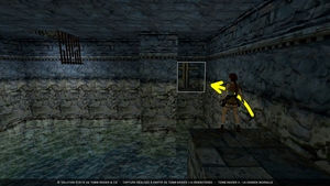 Revenir sur la corniche précédente et grimper sur les blocs pour arriver au pied de la tour (IMAGE 4). Faire un saut avec élan en face puis grimper dans l’ouverture. Aller à droite sur la grille (IMAGE 5) qui s’ouvre sous les pieds de Lara. Sortir de l’eau vers les escaliers puis, au bout, faire un saut avec élan vers le levier (IMAGE 6). L’abaisser pour ouvrir la porte et sortir.