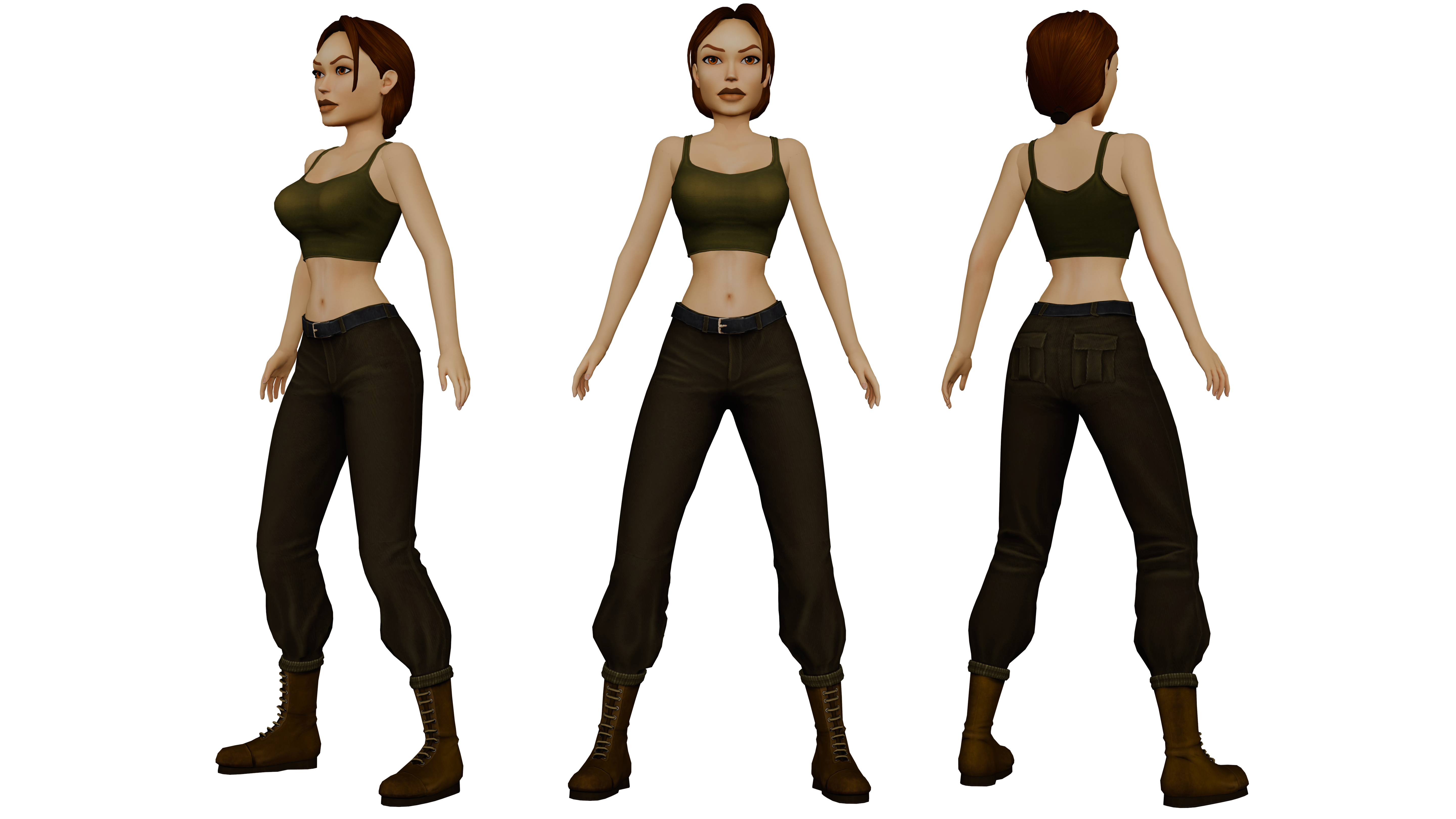 Dans TR2, le look principal de Lara est identique à celui de TR1 à un détail près : la tresse ! Pour rappel, celle-ci était envisagée dès le départ comme en témoignent les FMV de 1996, mais les possibilités techniques de l’époque ne le permettaient pas. Une animation rendue possible dans TR2 par le fait que Lara passe de 250 à 450 polygones, et qui apporte un peu plus de vie dans ses mouvements. La diversité des nouveaux environnements (aquatique, montagne, manoir ...) va permettre et surtout justifier l'apparition d'une véritable petite garde-robe pour Lara Croft, que nous vous proposons de découvrir juste après.