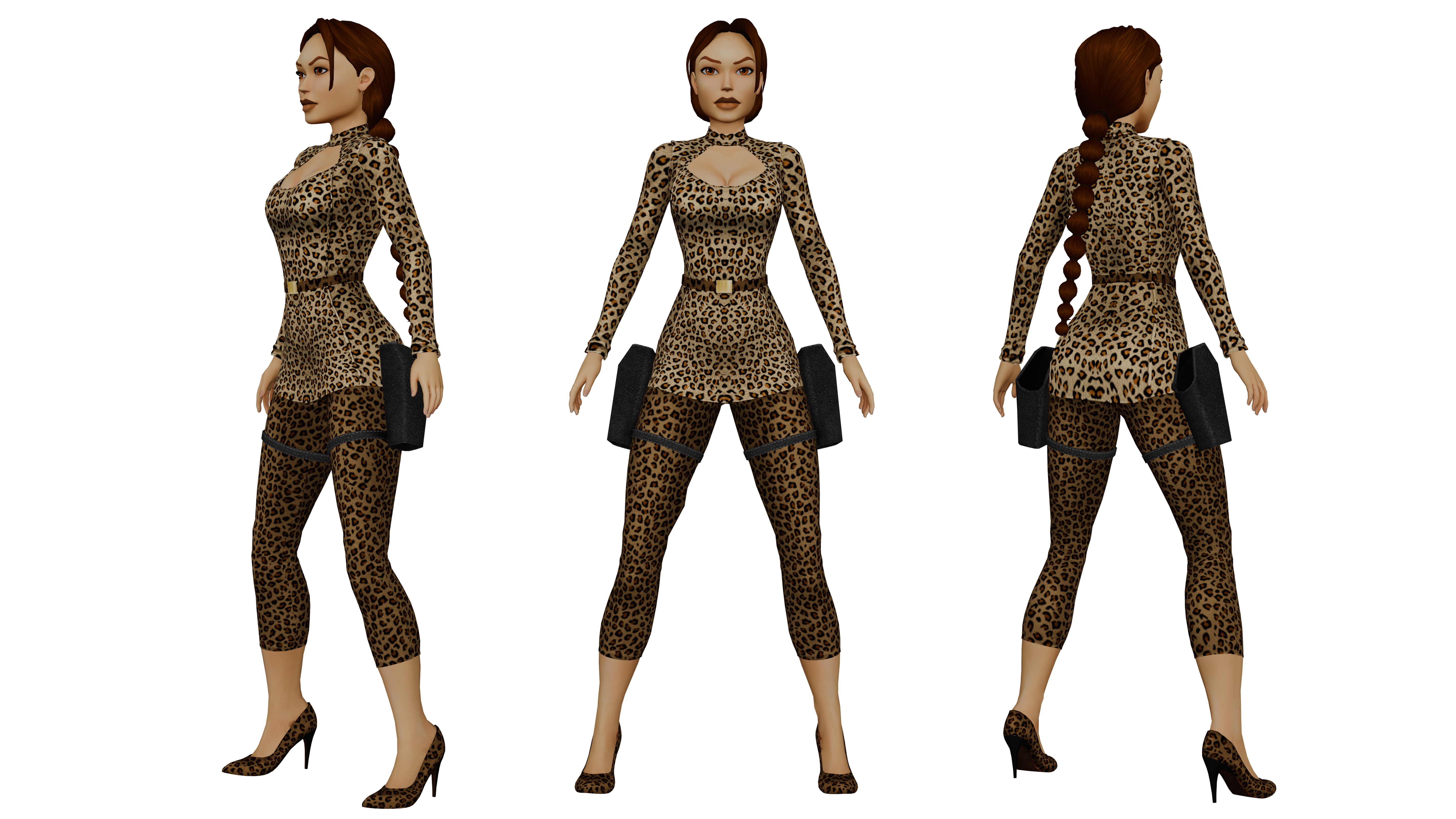 Mais le cauchemar ne s’arrête pas là, il est aussi vestimentaire : une tenue full léopard ! Dans une débauche de kitsch très loin des standards d’une lady britannique, Lara se retrouve affublée d’un haut clair au motif léopard, aux manches longues et coupe longue, tenu à la taille par une fine ceinture elle aussi léopard. Le col est fermé par un tour de cou sous lequel une échancrure laisse entrevoir le haut de la poitrine de Lara.